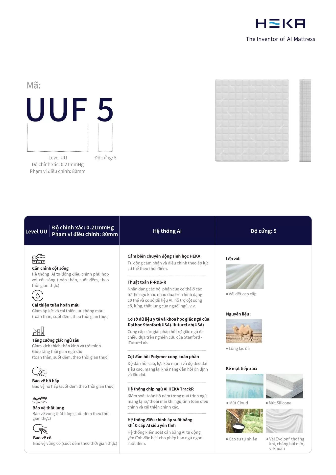 HEKA UU Series là lựa chọn hoàn hảo cho những ai tìm kiếm sự sang trọng và cảm giác êm ái tuyệt đối. Sản phẩm được thiết kế với lớp vải dệt cao cấp kết hợp đệm lông vũ và lớp chần từ lông lạc đà, mang lại cảm giác mềm mại, êm ái và đầy tinh tế. Bên cạnh đó, lớp mút mây (cloud foam), mút silicone, cao su và vải Evolon® kháng mạt bụi giúp nâng cao sự thoải mái và giảm áp lực hiệu quả, đem đến trải nghiệm giấc ngủ hoàn hảo.